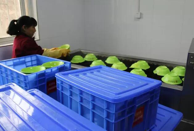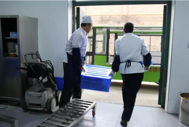 烘干后,工作人員將清洗過的餐具放進已消毒的中轉箱內,在規定時間配送至食堂。