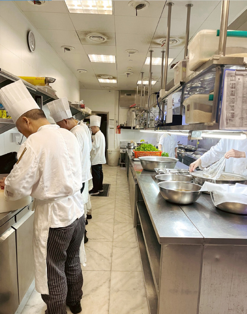 后廚是廚師的天下,尤其是大師傅,從客人點菜開始就是他們最忙碌的時候了,大師傅的廚藝是直接影響餐廳營業額的,但是在客人點菜之前,有大把的時間大師傅是沒有事情做的,打掃衛生也是保潔人員在做,切配、炒菜、打荷,這三個是一條線。有一家大酒樓在11:30以前,切配菜品的工作量比較大,如果大師傅跟切配的師傅一起切配菜,在11:30以前把分量備足,他們三個崗位之間就可以省下一個位置出來,到了炒菜的時候,大師傅炒菜,切配就轉化為打荷,而且大師傅也練習了基本功,這樣崗位就可以精簡,而且還快,工作效率高。