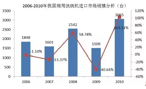 2006年我國商用洗碗機的進口規模為1848臺,同比下降1.1%,2007年為1601臺,同比下降13.37%,2008年該規模上升到2542臺,同比增長率達到58.78%,受金融危機影響,2009年我國商用洗碗機出口量減少到1509臺,同比下降40.64%,隨著經濟的復蘇,2010年我國商用洗碗機進口規模達到3065臺,同比增長率達到103.11%