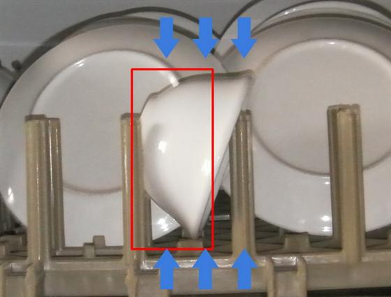 上圖所示我們可以看出:涂黑的部分是高壓噴淋沖不到的地方,還有A和B處也是無法沖洗到的,最多是其它地方的水淋上去的,“淋”與“噴”存在著根本的不同,噴是有壓力的,而淋是沒有壓力的,也就是此時沖刷餐具沒有壓力是無法確保完成噴淋沖刷動作的。因此是沒有壓力的,清洗出來的餐具最多只有85%的干凈。如果要想餐具清潔,他們在起初工作階段給洗碗工一定的好處,在上洗碗機(jī)之前來點小動作,先粗洗一下餐具,但在實際操作時根本不可能做到,所以餐具的干凈程度和人的工作質(zhì)量有關(guān),而不是靠洗碗機(jī)來保證了,因此高檔場所及要求較高的食堂、餐廳就要采用平放式洗碗機(jī)了。