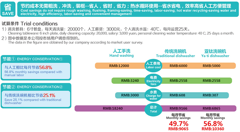 亞鈦洗碗機性能卓越:(異型餐具通洗,360℃無死角噴洗) ,獨立高溫水箱(確保高溫80℃消菌清洗) ,首創餐具軟壓帶(真正實現餐具零破損),集“粗洗,漂洗,清洗,風干”多功能一體,內置水循環系統(保證設備省電節水),后端獨立風機(確保餐具零水分),達到無與倫比的洗滌效果,大大節約能耗。